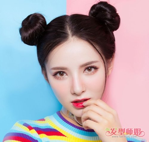 校园女生打造俏皮活力少女形象,春天穿卫衣出去玩的时候,可以考虑将你的头发盘成对称丸子头哟,反正你那么会挽发髻。中分哪吒头盘发与中分刘海搭配在一起,让女生美的更完美。