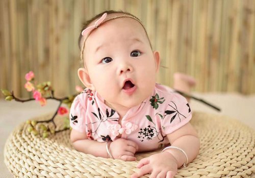 身穿粉色印花旗袍的10个月女宝宝,化身中国风小美女,就梳头发太短,看起来光秃秃的,不过没关系,聪明的妈妈给女儿系了一个细细的发带位于发际线位置,这样女儿的发型就出来了。