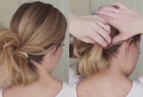 既然是一根皮筋搞定的盘发发型,就不要在头发刚开始的时候急着固定。先将头发全部拢在后脑,像是扎马尾一样,一手圈起来皮筋,握住马尾发根。