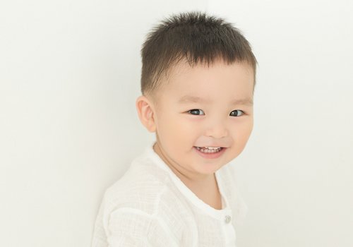 一岁多男宝宝脸圆头圆,笑起来特别的阳光治愈系,妈妈把儿子侧边头发剃掉,上面头发稍微留长,一款改良版男宝宝锅盖头就成了,其实属于寸头范畴,男宝宝看起来特别的干净有活力。