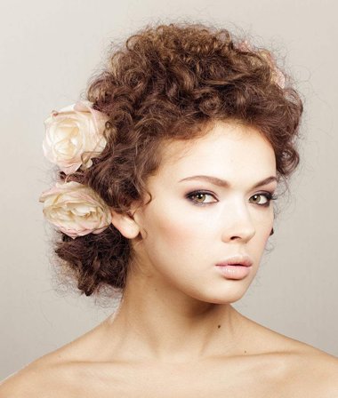 野性的浪漫是需要发型来修饰的,双头玫瑰的形象总是透着火辣与大气,盘发发型用羊毛卷梳发完成,就不用过多的花样,保持头发蓬松感之后,将发丝固定在脖颈向后的位置。