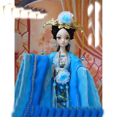 娃娃簪花高髻造型,显示出了女子端庄效果,把上部分头发梳盘起来,披散下来头发是如此美丽,金银发饰的结合透露出了无限美,与她的衣服超级般配发型。