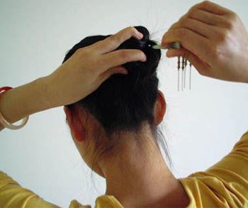 第六步:把发簪扭转360°之后,以水平方向向左横穿入发髻中。