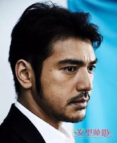 今年金城武将厚厚的黑色短发打理成清新时尚的剃两边短发发型,头顶短发简单烫卷之后,往一边梳理,聚集在头上,帅气的脸庞上蓄着浓浓的弧线,中年的金城武从奶油小生变身为气质型男。