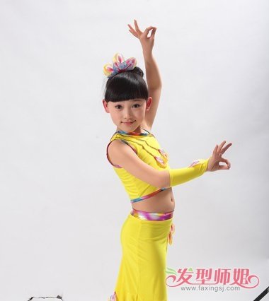 齐刘海的小女孩梳什么样的发型最好看?挑选孔雀舞的时候女童梳的发型,虽然简单也不能太过大意,比如这款丸子头盘发,发髻就要比上一款要大一些,女童盘发发型很俏皮。