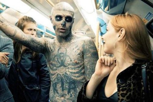 加拿大男孩Rick Genest是一名白化病患者,被发掘后就成为一名白化病男模,苍白的脸灰色的眼睛总无所畏惧的凝视着镜头。在经历过脑瘤等病痛后,他迷恋上了朋克和恐怖电影,也花了很多钱在身上纹上越来越多的人骨模样的团,最后使得自己变成了一个整体的骨架纹身,从此也走上了一条特立独行的道路。这位僵尸男孩成名后还曾演出过Lady Gaga的MV,赚了钱后他就生活的更加奢靡,但是就在距离他33岁生日仅有五天的时候他自杀在家中,据了解他生前也长期接受心理治疗,对此网友们评价的确有点走火入魔了,“疯子要么自我毁灭,要么流芳百世”。