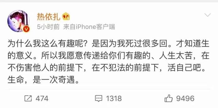 近日,演员热依扎发布微博感慨,开头第一句便是:“为什么我这么有趣呢?是因为我死过很多回”她还表示“人生太苦”。热依扎这一席话中充满了苦涩,让很多网友不禁感慨。