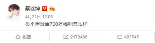 事情要从4月21日说起。那天,刚刚爆红的偶像蔡徐坤发了一条微博,说自己700万粉丝了,决定染个黑发当做粉丝福利。