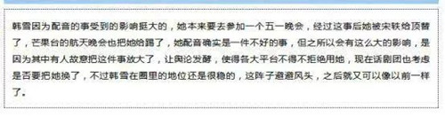 韩雪音乐剧假唱的事情传得沸沸扬扬,最近这一事件也引起了官媒的注意,昨日检察日报刊登了一篇“假唱说成‘完美’刷新行业下限”的文章,点名批评韩雪假唱。文章指出,韩雪演出当日由于身体原因无法正常演唱,却在观众坐定之后才上台通知这个消息,有恶意绑架之嫌。