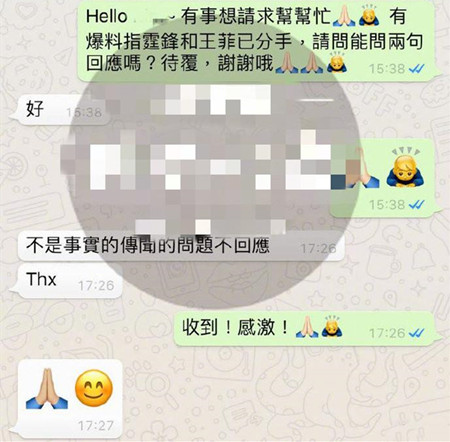 近日,有网友爆料称“厨子男星和天后女歌手分手了”,暗指谢霆锋王菲已经分手。对此,有媒体向谢霆锋所属经纪公司英皇娱乐求证,对方表示:“不是事实的传闻的问题不回应。”