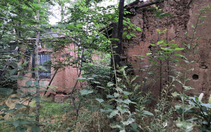围墙有好几处已经坍塌,从坍塌处可以看到院子里面的样子。院子里杂草丛生,还长有很多洋槐树、柳树和一些叫不上名字的树木。