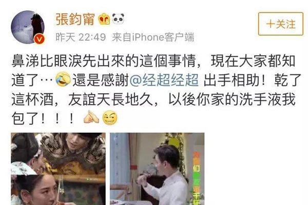 在这次事件中张钧甯和经超的表现都非常值得称赞,两个人都表现出了专业的演员素养,没有笑称机智应变把戏顺利地进行了下去,但为什么有人说张钧甯流鼻涕是人设崩塌啊,就算是明星也不可能不流鼻涕的啊,人家只是哭戏太投入了而已,这也有人黑?况且节目结束后张钧甯还特意发微博感谢经超,喊话说:“以后你家的洗手液我包了。”这明明是很有爱的一幕啊。
