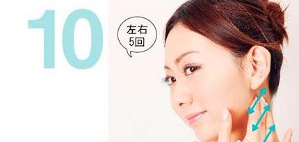 四指并拢,拇指张开。拇指放在腮骨处,其余四指放在太阳穴处。四指成为支点,拇指沿着腮骨从下巴处推按至耳朵旁。重复5次。