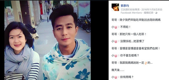 郭彦均与老婆陈玮珊从交往到结婚至今13年,感情恩爱如昔,对待老婆的妈妈(丈母娘)也当作自己的母亲一样孝顺。因为老婆是单亲家庭,从小由丈母娘一手带大,但婚后就只剩丈母娘一个人,所以郭彦均跟老婆说除夕年夜饭早点吃,这样就可以早点回去陪丈母娘。这段贴心对话PO上脸书后立刻获得网友大赞。