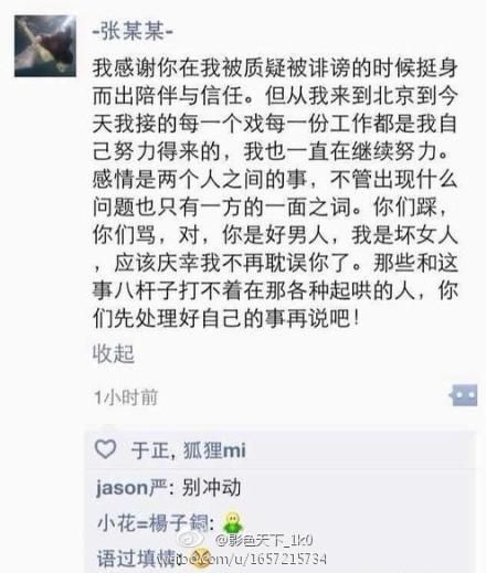 知情人士还透露,听闻此事后,李晨身边的朋友甚至想到张馨予的朋友圈群起而攻之,但最终也是李晨出面一直“稳住”大家,认为她以后还要在圈子里发展,对她应该宽容一点。而李晨的微博中,虽然已设置了粉丝无法评论,但与其互粉的好友还可以评论,有朋友留言“让坏人遭雷劈”,有人则留言“不用为错的人流泪,才能遇见对的人。”似乎圈内的人已知道两人的分手一事。
