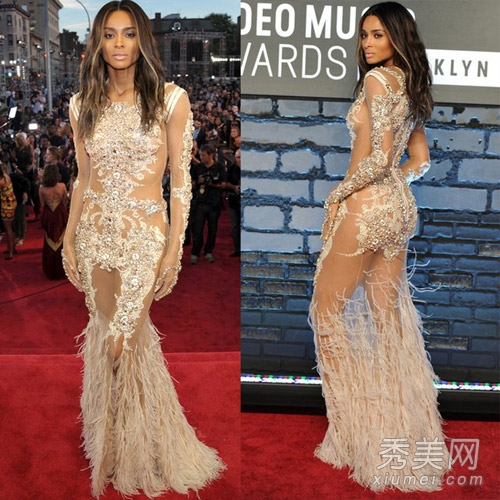 当地时间2013年8月25日,美国纽约,2013 MTV音乐录影带大奖。 Ciara 身穿羽毛透视裙水钻蕾丝下忽隐忽现着迷人美好的性感身材。