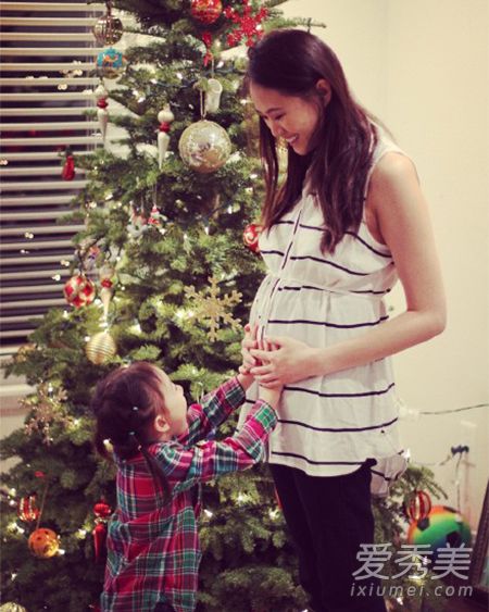 一张照片中的李安琪挺着孕肚,笑意满满的与奥莉对视,奥莉也一脸兴奋摸着妈妈的肚子。另外一张是李小鹏“一家四口”和圣诞老人的合影,李小鹏搂着妻子,奥莉则是坐在圣诞老人腿上。