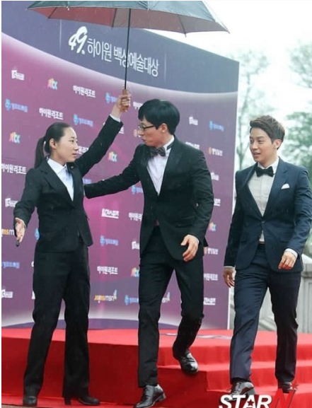 这是一次颁奖典礼前的红毯环节,因为当时下着雨一位女警卫就撑伞为他挡雨,刘在石说“没关系”后把伞让给警卫后自然地走过了红毯: