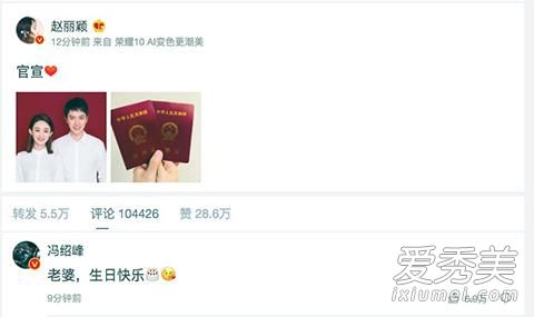 10月16日10点07分,赵丽颖在31岁生日当天大方公开与冯绍峰结婚证,配文“官宣”正式宣布结婚喜讯。