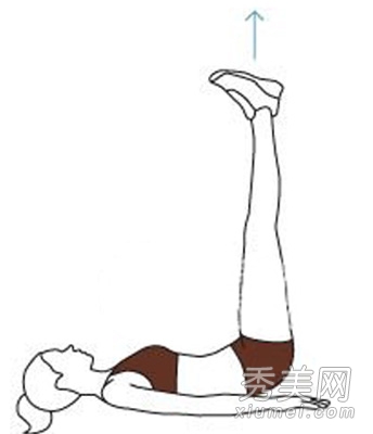 Step5 平躺,双腿举高,手臂放于体侧,手心向下。吸气,收腹,臀部缓缓抬离地面,背部做支撑,腿要一直保持直立,不要弯曲。吸气,慢慢放下腿。动作重复10次。