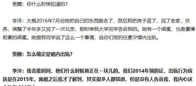 李洋还称,任素汐在离婚时一直认为自己是有过错的一方,任素汐曾对李洋说希望不要给他带来更大的伤害。但李洋表示不想跟她说任何话。事件曝光时,董博的前妻也在微博发声,认定二人是婚内出轨,并表示“人在做天在看,好自为之”。她也表达了自己在出轨事件中家人受到的伤害。