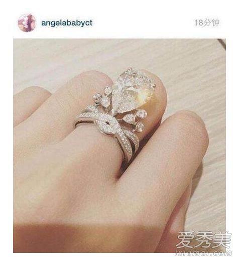 之前明星们也戴过各种“鸽子蛋”,比如Angelababy杨颖晒过的巨型婚戒,据悉该钻戒镶有1颗5.53克拉美钻,以及73颗明亮式切割钻石,估价超过千万。