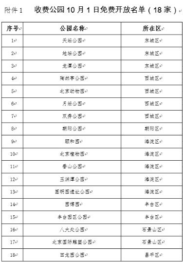 一、10月1日当天,部分收费公园免费开放(名单附后),其中,天坛公园、地坛公园、陶然亭公园、朝阳公园、园博园、北京国际雕塑公园、颐和园、北京动物园、八大处公园等9家公园免费不免票,市民和游客可通过公布的网站、微信公众号、APP进行预约,并到指定地点兑换门票。当日凭门票入园,其它票证无效。全市300余家免费公园(名单可查询北京市园林绿化局网站)正常开放。个别公园因举办活动部分时段闭园,具体时间以公园发布的公告为准。