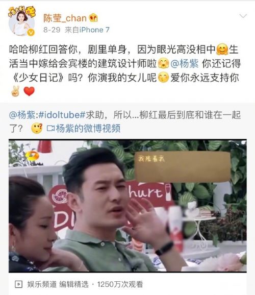 9月10日,柳红回复杨紫登上热搜,近日杨紫在《中餐厅》里记错了《还珠格格》中的人物关系,以为萧剑跟柳红在一起,饰演柳红的演员陈莹随后转发回复,详细为杨紫解答了柳红最后的归宿。9月9日晚,杨紫又连发数条评论补习《还珠格格》,终于理清了所有人物关系。