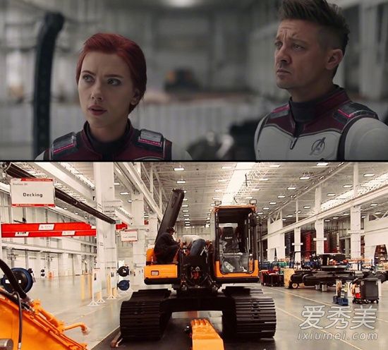 据悉,《复联4》中很多室内的戏份其实都是在车间里面拍摄的,而这个车间原本用来停放挖掘机。在对比图中可以看到,备受喜爱的黑寡妇、鹰眼、美国队长等,他们拍戏的地方原本停的都是挖掘机。电影中放着高大上设备的地方,原本也是用来放置挖掘机的。