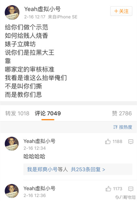 郑爽爸爸发了条微博,@ 了一个账号“Yeah虚拟小号”,疑似在推郑爽小号。郑爽发了几条微博,“给你们做个示范,如何给贱人烧香,婊子立牌坊”、“我来微博刚好观察下人心 ????”。这一口婊子一口贱人的,也太放飞自我了吧……?