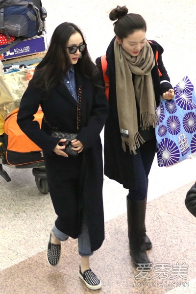 1月16日杨幂机场街拍,身穿黑色斗篷大衣,搭配黑色紧身裤和低跟短靴,一身黑色造型,气场十足,戴着黑色毛线帽,减龄显嫩不少。
